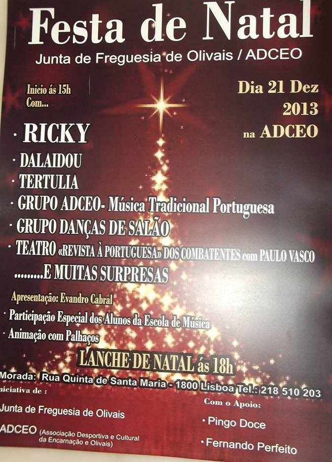 A Associação Desportiva e Cultural da Encarnação e Olivais (ADCEO) e a Junta de Freguesia dos Olivais realizam, este Sábado, a sua festa de Natal.