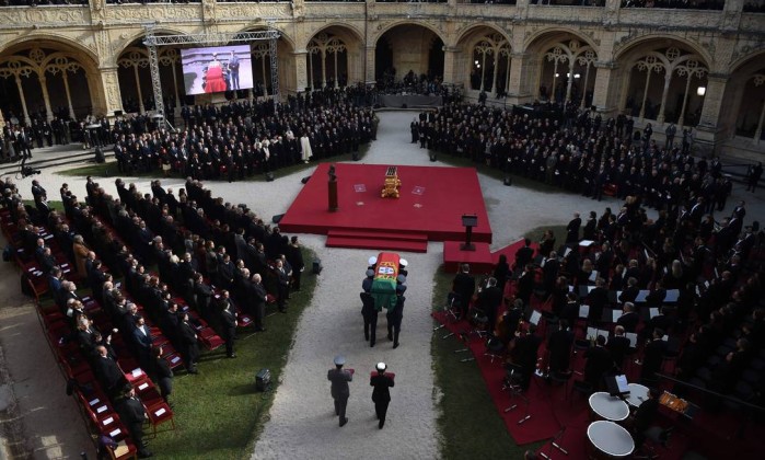 Um dos momentos altos das exéquias fúnebres de Mário Soares teve lugar na cerimónia celebrada nos claustros do Mosteiro dos Jerónimos. Intervieram neste momento emotivo os filhos, Isabel e João Soares, o Presidente da República, Marcelo Rebelo de Sousa, e o presidente da Assembleia da República, Eduardo Ferro Rodrigues.