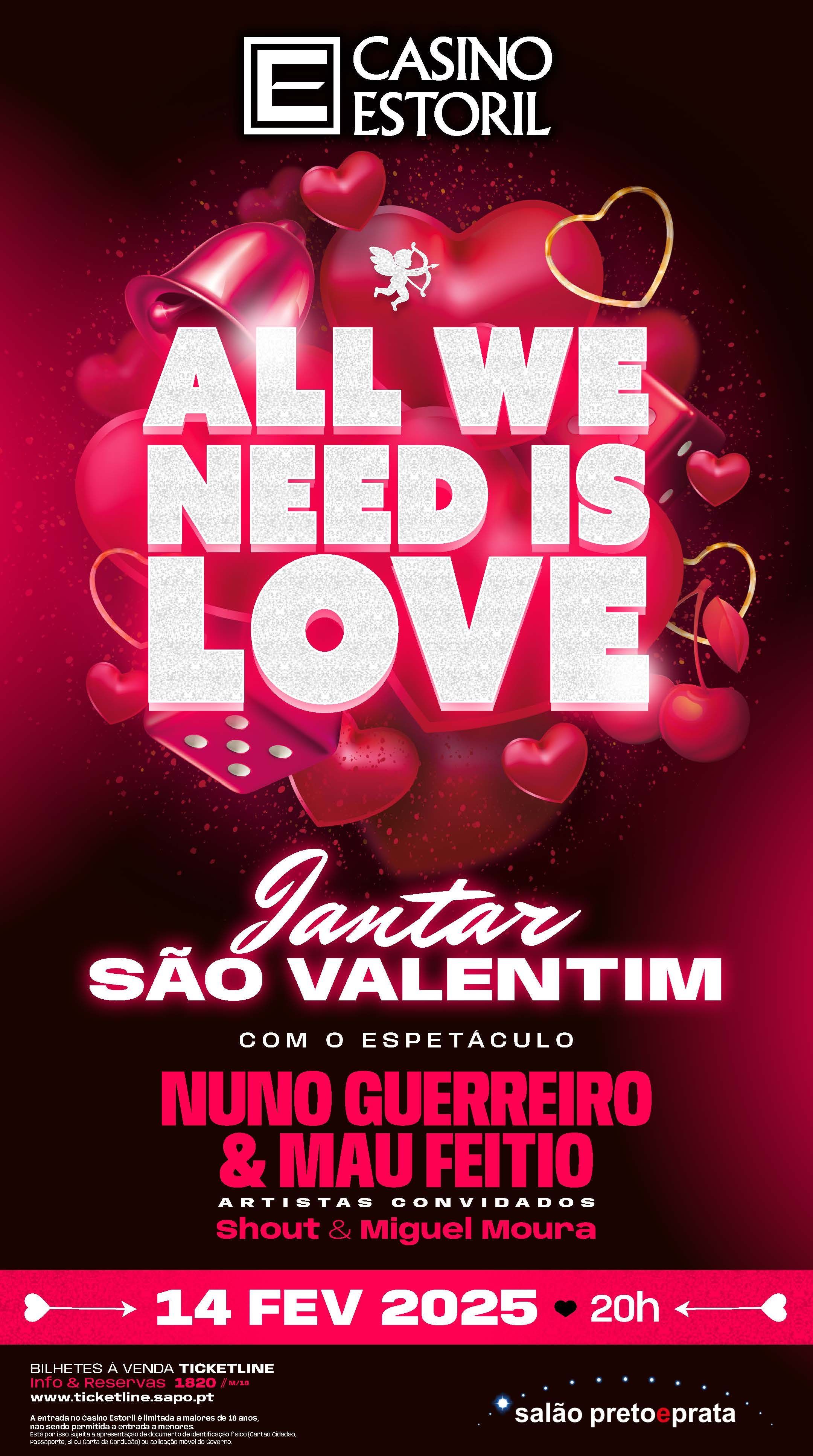 Em noite de São Valentim, 14 de fevereiro, a partir das 20 horas, o Casino Estoril propõe um jantar romântico e espectáculo de Nuno Guerreiro & Mau Feitio com os convidados Shout e Miguel Moura. Traje recomendado: fato escuro. M/18. Preço: 75€.